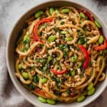 This 15-minute Vegan Chili Garlic Noodles recipe is a quick, flavorful Asian-inspired dish featuring chewy udon noodles tossed in a vibrant garlic chili oil with crunchy peanuts, fresh bell peppers, edamame, and herbs. It’s perfect for a speedy vegan meal that packs a punch with Sichuan chile flakes and a tangy Chinese black vinegar dressing.
