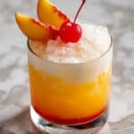 The image shows a short clear glass filled with a layered drink. The bottom layer is a bright orange color with a smooth texture, followed by a creamy off-white layer in the middle that looks slightly frothy. On top, there is a pile of crushed ice that spills over the glass edges a little. The drink is garnished with a slice of peach and a red cherry stuck together and placed on the rim of the glass. The glass is set on a white marbled surface. Photo taken with an iphone --ar 4:5 --v 7