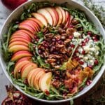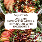 A vibrant and flavorful Autumn Harvest Honeycrisp Apple and Feta Salad combining toasted spiced nuts, crispy prosciutto, fresh arugula, sweet apples, creamy avocado, and tart pomegranate arils, all tossed in a tangy homemade vinaigrette for a perfect balance of sweet, savory, and spicy flavors.