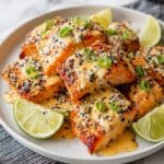 This Bang Bang Salmon recipe features crispy, bite-sized salmon pieces perfectly seasoned and air-fried to perfection. Tossed in a creamy, tangy, and spicy homemade Bang Bang sauce made from mayonnaise, Thai sweet chili sauce, sriracha, honey, and lime juice, this dish is a flavorful and vibrant appetizer or main course that comes together quickly and easily.
