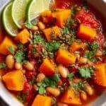 This hearty Butternut Squash Chili with White Beans is a flavorful vegetarian dish that combines sweet roasted butternut squash with tender white beans and a blend of warming spices. Perfect for a cozy weeknight meal, this chili simmers on the stovetop until the squash is tender and infused with robust chili flavors. Garnished with fresh cilantro and a squeeze of lime, it’s a wholesome and satisfying dish that’s both nutritious and comforting.