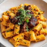 - Combine: Add the cooked rigatoni to the sauce, tossing well to coat. Use the reserved pasta water as needed to thin the sauce to your desired consistency. Gently fold in the seared steak tips, making sure they are evenly incorporated.