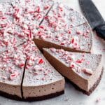 - Remove from Pan and Garnish: Before serving, run a plastic knife carefully around the edges of the springform pan to loosen the sides, then remove the pan’s ring. Sprinkle the top of the pie with powdered sugar and crushed peppermint candy canes for a festive and decorative finish.