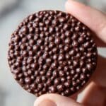 A close-up view of a round chocolate treat held between the fingers of a woman's hand, showing a textured surface covered in small, rounded chocolate bits giving it a bumpy look. The chocolate is dark brown and shiny, with visible light reflections highlighting its smooth and crunchy texture. The background is a soft, blurred white marbled texture, allowing the focus to stay on the detailed chocolate piece. photo taken with an iphone --ar 4:5 --v 7