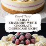 Keywords: Christmas cheesecake, cranberry cheesecake, white chocolate mousse, holiday dessert, graham crust cheesecake, festive dessert, water bath cheesecake