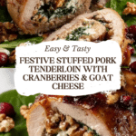 Keywords: Christmas pork tenderloin, stuffed pork tenderloin, holiday pork recipe, pork with cranberries, goat cheese pork, festive pork recipe
