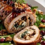 This Christmas stuffed pork tenderloin is a festive and flavorful main dish perfect for holiday celebrations. Filled with a tasty mixture of cranberries, goat cheese, and walnuts, it combines savory and sweet in every bite. Impress your guests with this elegant yet easy-to-make recipe.