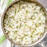A zesty and fragrant cilantro lime rice perfect as a versatile side dish. Made with jasmine rice cooked to fluffy perfection, infused with sautéed onions and garlic, then brightened with fresh lime juice and chopped cilantro for a vibrant flavor.