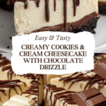 This Cookies & Cream Cheesecake with Chocolate Drizzle is a decadent dessert combining a crunchy chocolate cookie crust with a smooth and creamy cheesecake filling studded with crushed chocolate cookies. Topped with a rich semi-sweet chocolate drizzle and additional cookie pieces, it’s perfect for chocolate lovers seeking a luxurious treat that’s elegant enough for special occasions.