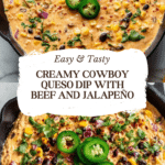 Cowboy Queso Dip is a hearty, flavorful cheese dip packed with ground beef, beans, and a kick of jalapeño. Perfect for game days or casual gatherings, this dip combines creamy cheeses and zesty ingredients for a crowd-pleasing appetizer.