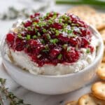 - Top and Garnish: Spoon the strained cranberry mixture evenly over the cream cheese base. Sprinkle flaky sea salt over the top if using, and garnish with the reserved green onion greens for added color and freshness.