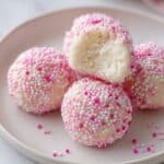 The image shows four soft, round sweets placed on a white plate, all covered with tiny pink and white round sprinkles that create a textured surface. One sweet is broken open at the front, revealing a fluffy and moist white inside with a slightly crumbly texture. The sweets have a thin outer layer of light pink color beneath the sprinkles, contrasting with the pure white inside. The plate rests on a white marbled surface, enhancing the soft pastel colors of the sweets, photo taken with an iphone --ar 4:5 --v 7