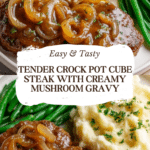 Keywords: cube steak recipe, crock pot cube steak, slow cooker steak, mushroom gravy steak, easy crock pot meal, comfort food