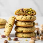 A stack of six golden cookies with visible green and brown pistachio pieces mixed throughout, sitting on a white marbled surface. The top cookie is broken in half, showing a soft and crumbly interior with bits of pistachio embedded inside. Two whole cookies lean against the stack, highlighting the rough texture and nutty chunks. Scattered pistachio nuts and cookie crumbs surround the stack, enhancing the fresh and rustic feel of the scene. photo taken with an iphone --ar 4:5 --v 7