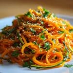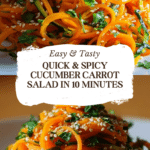 A quick and refreshing Asian-inspired cucumber carrot salad featuring julienned vegetables tossed in a spicy, savory dressing with sesame seeds. This crisp and flavorful salad is perfect for beginners and ready in just 10 minutes.