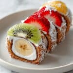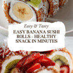 Keywords: banana sushi rolls, healthy snack, peanut butter banana, no-bake dessert, kids snack, easy recipes, vegetarian snack, fruit snack, fun snacks for kids, customizable toppings