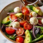 This Easy Cucumber Mozzarella Salad is a refreshing Italian-inspired side dish combining crisp cucumber slices, juicy cherry tomatoes, creamy mozzarella balls, ripe avocado, and fresh basil in a light herb dressing made with olive oil, balsamic vinegar, garlic, salt, and pepper. Perfect for quick preparation with no cooking required, it offers a healthy, flavorful, and vibrant salad ideal for summer gatherings, weeknight dinners, or light meals.