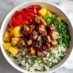 A white bowl filled with a colorful dish consisting of four layers. At the bottom is a bed of white rice mixed with green herbs, giving a fresh look. On top, there are small, browned grilled chicken cubes with a shiny glaze, arranged neatly in the center. To the left, there are bright red bell pepper pieces, and to the right, golden yellow pineapple chunks. Behind the chicken, there are green bell pepper pieces adding more color contrast. The bowl sits on a white marbled surface. Photo taken with an iphone --ar 4:5 --v 7