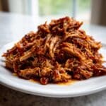 A white plate sits on a white marbled surface, piled high with shredded meat that is rich brown with hints of reddish sauce. The meat strands look tender and slightly wet, with some glistening areas showing the sauce coating. The pile is uneven, with chunks and thin shreds mixed together, giving it a textured and juicy appearance. The background is softly blurred with natural light coming from a window. Photo taken with an iphone --ar 4:5 --v 7