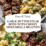 Keywords: Garlic butter steak bites, cheesy rigatoni, steak with pasta, comfort food, easy dinner, creamy mozzarella pasta, sirloin steak bites, garlic butter sauce