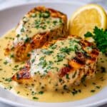 The image shows two pieces of golden brown grilled chicken with grill marks, topped with creamy light yellow sauce and sprinkled with small green parsley leaves. To the right of the chicken is half a yellow lemon with a textured surface. The background is a white marbled texture. photo taken with an iphone --ar 4:5 --v 7