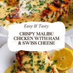 Golden Crispy Malibu Chicken is a deliciously satisfying dish featuring tender chicken breasts stacked with ham and Swiss cheese. Crispy on the outside and juicy inside, it’s finished with a tangy homemade mustard sauce that elevates every bite.