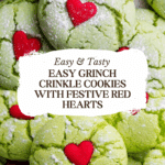 These Grinch Crinkle Cookies are a festive and fun treat perfect for holiday celebrations. Made with a yellow cake mix tinted a vibrant green and rolled in powdered sugar, these soft, crinkly cookies are topped with adorable red heart sprinkles inspired by the Grinch’s heart-growing moment. Easy to prepare and perfect for kids and adults alike, these cookies bring a playful twist to classic crinkle cookies.