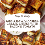 A deliciously sweet and savory Hawaiian Roll Grilled Cheese sandwich featuring melted Monterey Jack cheese, buttery rolls, and optional crispy bacon and fresh tomato slices for extra flavor and texture, perfect for a quick and satisfying meal.