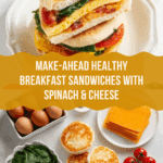 This Healthy Breakfast Sandwich recipe is a make-ahead, nutritious morning meal that combines sautéed spinach and onions, fluffy baked eggs with cheddar cheese, and toasted English muffins topped with melted cheddar slices. It’s perfect for busy mornings, offering a balanced breakfast with protein, veggies, and whole grains in a convenient sandwich form.