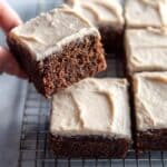 A close-up image of a white square cake cut into nine pieces, with one piece held above the cake by a woman's hand, showing the inside texture. The cake has two layers: a dark brown moist base layer that looks soft and dense, topped with a smooth, light beige frosting that is evenly spread with slight swirls across the top. The cake sits on a silver wire cooling rack with a white marbled surface below. photo taken with an iphone --ar 4:5 --v 7