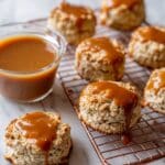 A close-up view of several oatmeal cookies with a rough, crumbly texture and golden-brown color, each topped with a thick layer of glossy caramel sauce that drips down the sides. The cookies are placed on a copper cooling rack, and next to them is a clear round bowl filled with smooth caramel sauce, showing tiny air bubbles on its surface. The background is a white marbled texture, adding light contrast to the warm tones of the cookies and caramel. photo taken with an iphone --ar 4:5 --v 7