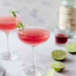 Two clear cocktail glasses filled with bright pink liquid with a smooth, slightly frothy texture form the main focus. Each glass stands tall on a thin stem and is garnished with a bright green lime peel twisted on the rim. Around the glasses, there are small lime wedges and squeezed lime halves with a juicy, pale green interior scattered on a white marbled surface. To the left, a partially visible clear bottle with a white label and a cork lies next to a small glass with dark red liquid inside. The whole scene is bright and clean, with soft natural light enhancing the colors and clarity of the drink and garnishes. Photo taken with an iphone --ar 4:5 --v 7