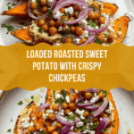 Loaded Roasted Sweet Potato with Hummus and Roasted Chickpeas is a nutritious and flavorful plant-based meal packed with protein, fiber, and vitamins. This easy-to-make Mediterranean-inspired recipe features caramelized sweet potatoes topped with creamy hummus, crispy spiced chickpeas, fresh red onion, parsley, and optional vegan feta cheese, making it perfect for weeknight dinners or meal prep.