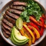 This Low Carb Steak Fajita Bowl is a flavorful keto-friendly recipe featuring marinated flank steak, sautéed bell peppers and onions, and seasoned cauliflower rice. Perfect for a nutritious, satisfying meal that’s rich in protein and low in carbs, topped with fresh avocado, salsa, and dairy-free sour cream.