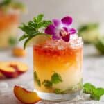 - Top and Garnish: Add more crushed ice to fill the glass, then top with four dashes of bitters to balance the sweetness and add complexity. Finish by garnishing with a fresh mint sprig, a beautiful orchid flower, and a lime round for visual appeal and aroma.