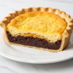Mennonite Funny Cake Pie is a delightful dessert featuring a rich chocolate topping poured over a tender, vanilla-infused cake base baked in a flaky pie crust. This unique layered treat combines a moist cake with a luscious chocolate syrup, making it a comforting and visually appealing pie perfect for any occasion.