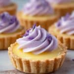 A close-up view of small tarts, each with a golden, crumbly base forming the first layer. On top is a smooth, glossy pale yellow filling that looks like lemon curd. The third layer is a swirl of soft, light purple whipped cream, piped neatly around the tart. Small, delicate purple flowers decorate the whipped cream, adding a fresh, natural touch. The tarts rest on a white marbled surface with a soft focus background showing more tarts. photo taken with an iphone --ar 4:5 --v 7