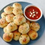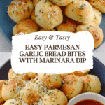 Parmesan Bread Bites are bite-sized pieces of soft pizza dough brushed with flavorful garlic butter and topped with parmesan cheese. Perfectly golden and served with marinara sauce, they make an irresistible appetizer or snack for any occasion.