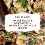 Keywords: Peach focaccia, sourdough focaccia, mozzarella focaccia, summer bread, savory peach bread, baked focaccia, sourdough bread recipe, hot honey focaccia