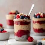 - Assemble Jars: When ready to serve, take clean jars and smudge a little peanut butter inside each jar if desired. Layer the oats by filling about one-third of the jar with the overnight oat mixture, then add 2 tablespoons of chia seed jam on top.