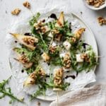 These pear and brie cheese salad skewers combine the sweetness of ripe pears, the creaminess of brie cheese, peppery baby arugula, and crunchy walnuts, all brought together with a drizzle of tangy balsamic glaze. They make a quick, easy, and elegant sweet and savory appetizer perfect for parties or gatherings.