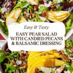Keywords: pear salad, balsamic vinaigrette, candied pecans, autumn salad, fresh pears, healthy salad