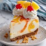 This Pineapple Orange Swirl Cheesecake is a delightful tropical dessert featuring a buttery Nilla wafer crust, a creamy pineapple layer, and a vibrant orange cheesecake swirl. The luscious combination of tangy pineapple, fresh orange juice, and rich cream cheese creates a refreshing and indulgent treat perfect for any occasion. It is finished with a smooth sour cream topping and garnished for a beautiful presentation.