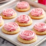 Keywords: Pink lemonade cookies, lemon cookies, lemon dessert, frosting cookies, pink cookies, party cookies, lemon extract, sweet treats