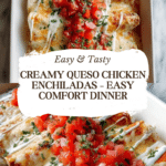 Queso Chicken Enchiladas feature tender shredded chicken and a blend of cheeses rolled into corn tortillas, all smothered in a creamy homemade queso sauce and baked to bubbly golden perfection. This cheesy comfort food dinner is ready in just 45 minutes, making it a perfect weeknight meal full of rich Mexican-American flavors.