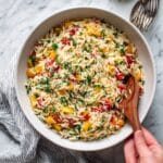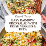 Keywords: orzo salad, rainbow salad, Mediterranean salad, vegetarian pasta salad, summer salad, easy lunch recipe