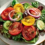 This vibrant red and green salad is a fresh, colorful mix perfect for a light lunch or as a side dish. Packed with crisp vegetables and a tangy homemade dressing, it’s both simple and satisfying.