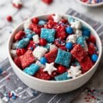 Keywords: Muddy Buddies, Chex Mix, Patriotic Snack, Candy Coated Cereal, Red White Blue Treat, Holiday Snack