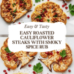 This recipe for Cauliflower Steaks offers a delicious and healthy vegetarian main dish made by slicing a cauliflower head into thick ‘steaks,’ marinating them with a flavorful blend of smoked paprika, garlic, cumin, and chili powder, and roasting until golden and tender. Perfect as a plant-based entrée or side, these cauliflower steaks are beautifully garnished with chopped parsley and pomegranate seeds for a fresh and vibrant finish.