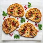 This recipe for Cauliflower Steaks offers a delicious and healthy vegetarian main dish made by slicing a cauliflower head into thick ‘steaks,’ marinating them with a flavorful blend of smoked paprika, garlic, cumin, and chili powder, and roasting until golden and tender. Perfect as a plant-based entrée or side, these cauliflower steaks are beautifully garnished with chopped parsley and pomegranate seeds for a fresh and vibrant finish.